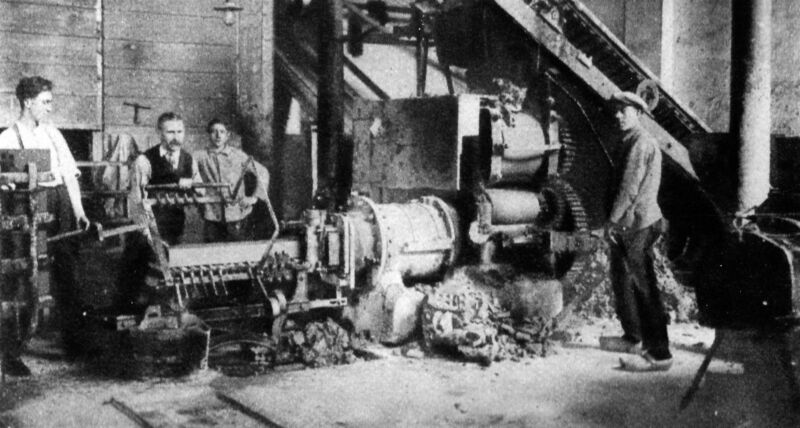 Je kunt met deze pers klei in een bepaalde vorm persen, in dit geval kunnen van de stang klei stenen gemaakt worden.