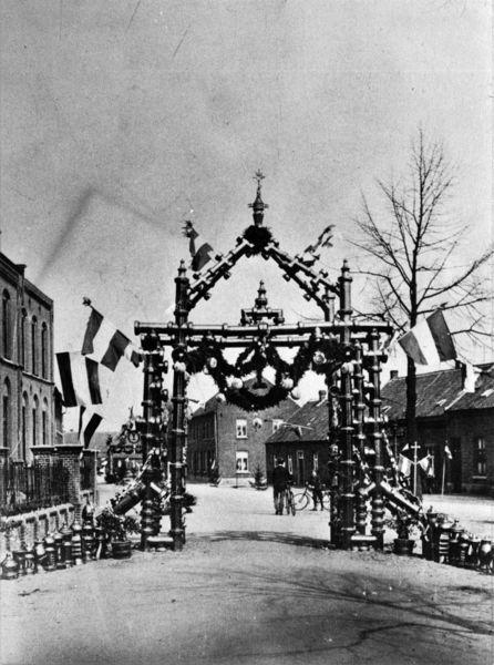 Ereboog ter ere van de priesterwijding van Frans Heines. De boog is gemaakt onder leiding van Pierre Lankes, baas bij greswarenfabriek Teeuwen.