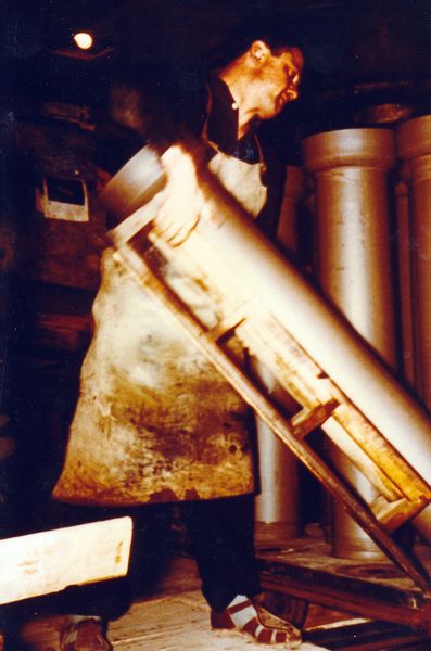 Buis wordt op wagen voor droogkamer gezet. Greswarenfabriek Laumans