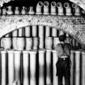 Sjaak Geelen bezig de buizen, hulpstukken en kruiken te "zetten". Grofkeramische fabriek Laumans.