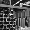 Greswarenfabriek Teeuwen. De buizen welke uit de oven komen worden op pallets gestapeld.