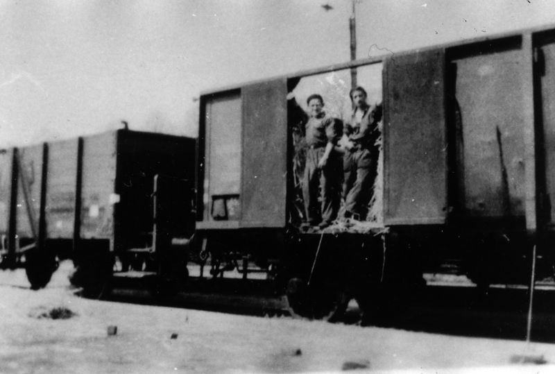 Buizen laden bij de fabriek van Janssen-Willemsen. Links in wagon: Jan van de Ven en rechts Jan Teeuwen..