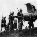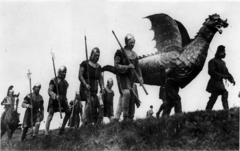 Het leger komt met de gevangen draak terug. Het spel van het draaksteken werd destijds opgevoerd bij de Maas.