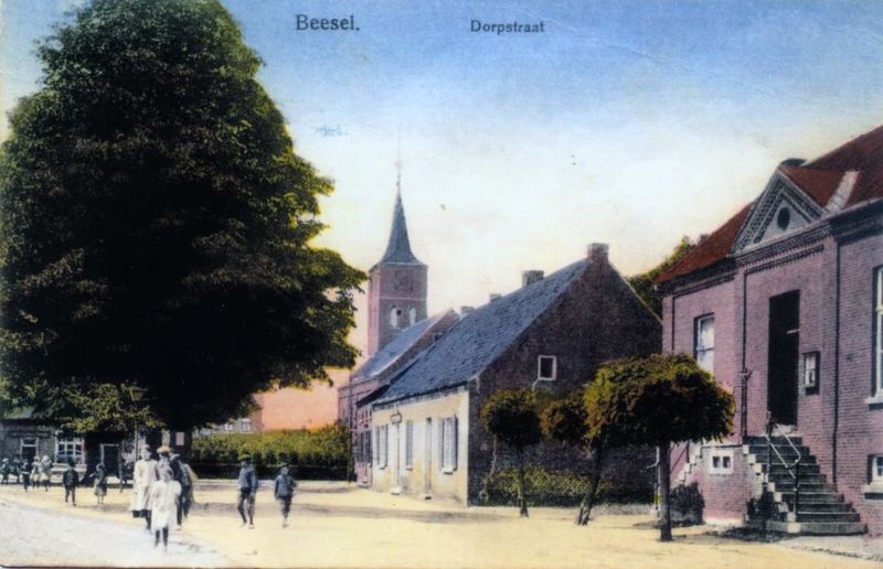 De vroegere Dorpsstraat van Beesel, nu Monseigneur Theelenstraat, met rechts het oude raadhuis. Prentbriefkaart in kleur.