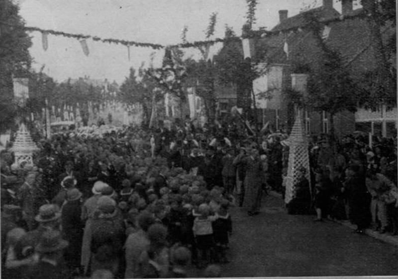 Mgr Lemmens loopt door de straten van Reuver tijdens het eeuwfeest