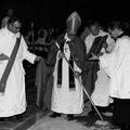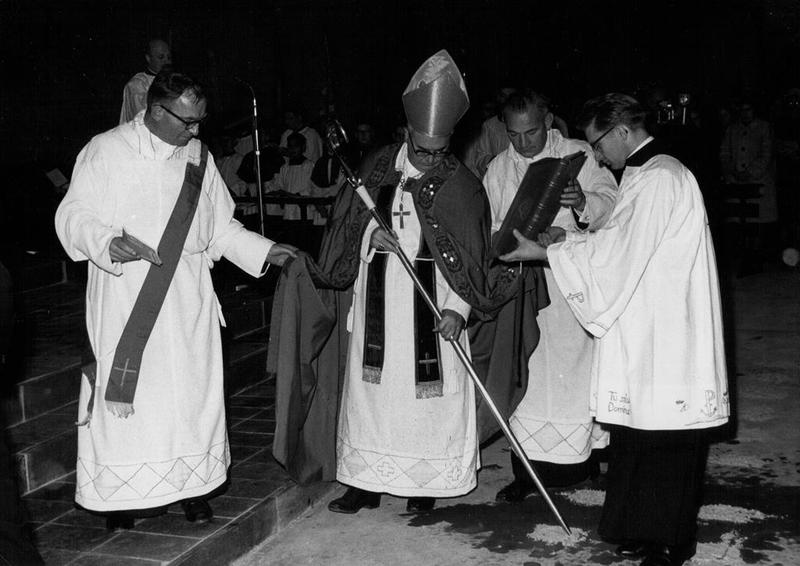 Inwijding van de Fatimakerk in Offenbeek door Mgr Moors en links Pastoor P.vd Broek en links op de achtergrond Pater Weiss (rector van Offenbeek)