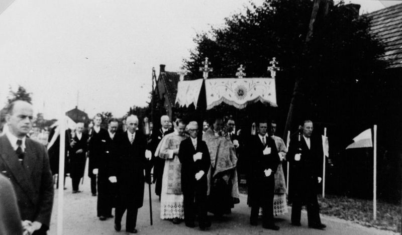 Voorop lopen Peter Killaars (links) en Jac Laumans met lantaarns. Achter Peter loopt Wevers, secretaris van het kerkbestuur.