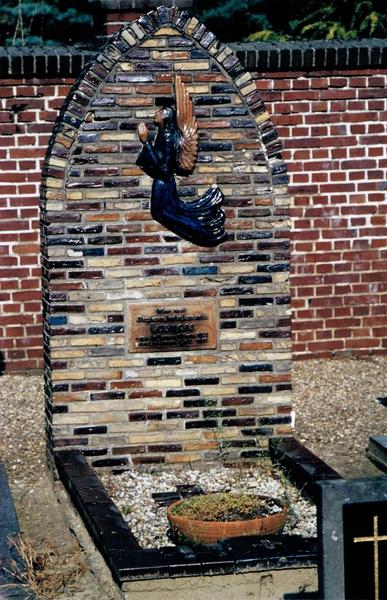 Grafmonument: Stele uit liliputsteentjes. Keramiek: Laumans. Ontwerp en uitvoering: onbekend Graf nummer B9. Stephanus Laumans * 8-3-1902; +8-7-1910