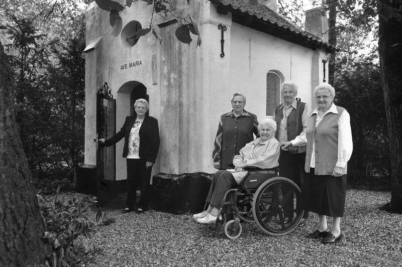 Gezusters Mobers (Dochters van Sef Mobers) bij het Mariakapelke (Klaashofkapelke). Van links naar rechts: Nellie Rovers - Mobers, Ann Mobers, Martha Linssen - Mobers, Mie Killaars Mobers, To Bergs Mobers