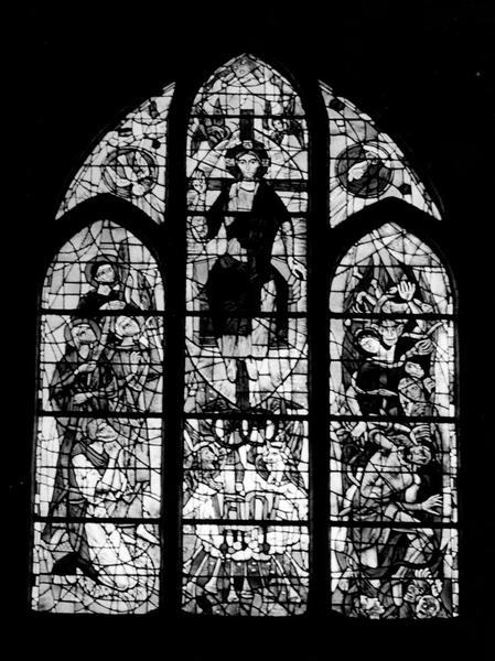Glas-in-lood raam in de St.Lambertuskerk voorstellende het laatste oordeel.