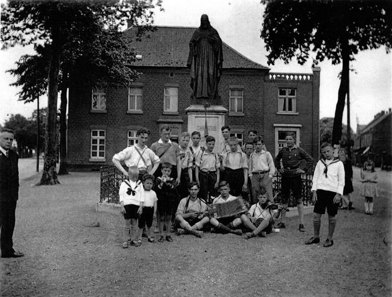 Duitse Wandervögel voor het oude gemeentehuis met links Willem Muller. Rechts staan de kinderen van Hoogma (hij woonde in het gemeentehuis rechts). Links de kinderen van Thijssen.