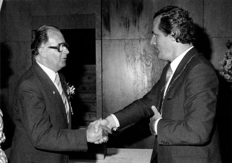 Burgemeester Peeters feliciteert J. Naus tijdens het 60 jarige bestaan van Belfeldia