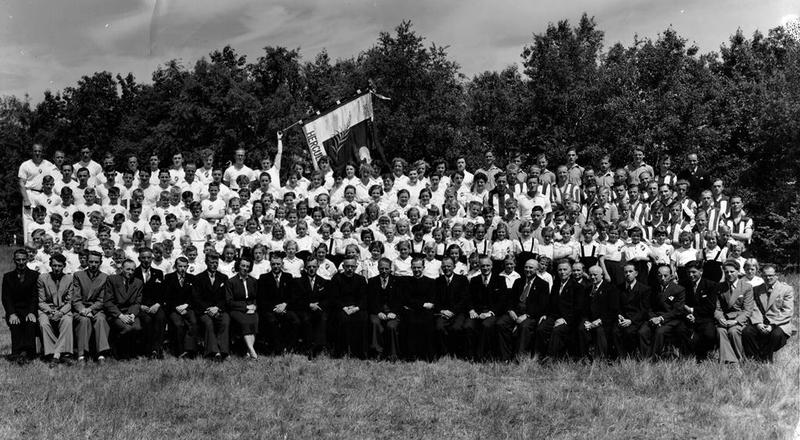 Groepsfoto ter ere van het 50 jarig jubileum van de Gymnastiek en atletiek vereniging "Hercules" .