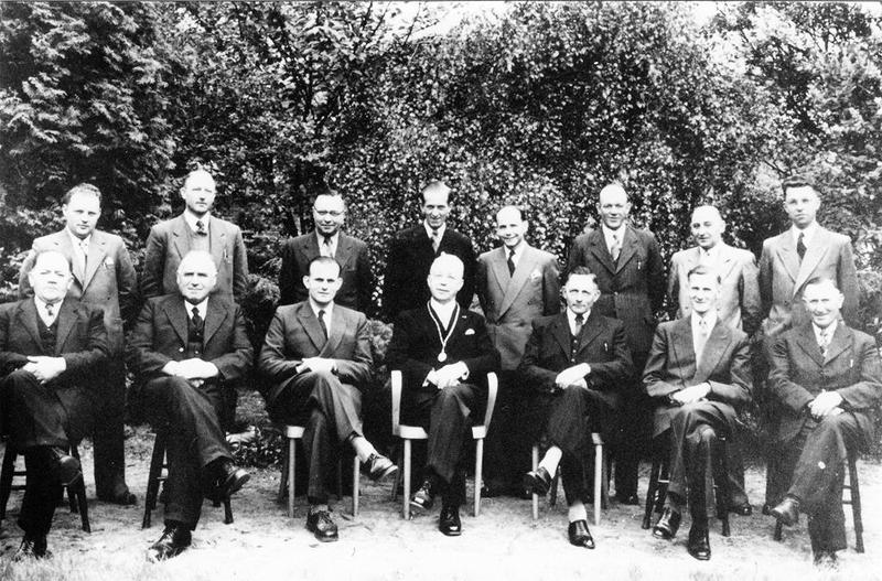 zittend: J. Simons, Sjeng Steeghs weth., H. Teunissen, Claessen burg., N. de Vlieger weth., van Kempen weth., J. Smolenaars. staand: L. v.d. Velden, S. Peeters, H. Geraeds, P. Vincent, P. Lommen (Coop), L, Geujen, F. Cremers, J. Laumans jr.