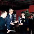 Burgemeester Nuytens reikt een beker uit aan de winnaar van het Reuvers biljartkampioenschap in het bijzijn van de voorzitter van BC Reuver Geert Huskens