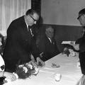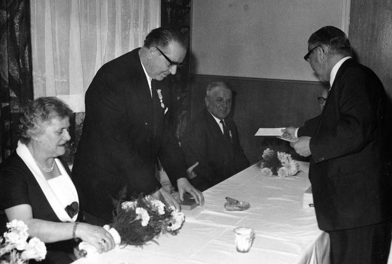 Baer Janssen (Hoeb van Nuize) krijgt oorkonde uitgereikt door Rein Janssen, directeur van greswarenfabriek Janssen-Willemsen.
