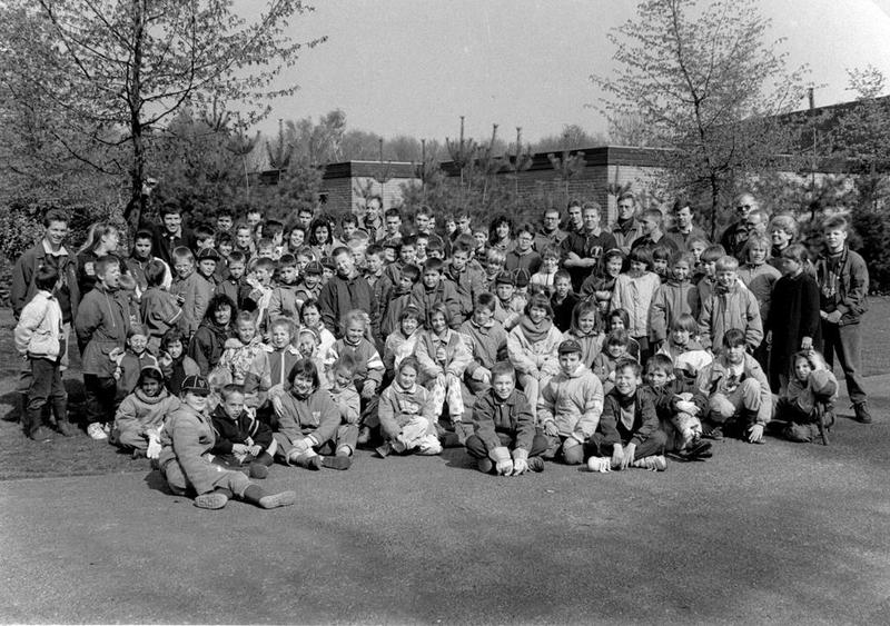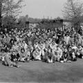 Groepsfoto van de verkenners van Scouting Lambertus samen met een vertegenwoordiging van de Gemeente (Burgemeester Nuytens, Mr. Peulen en Mevr. B. Hoover-Van Lierop). De foto is geknipt bij de Lommerbergen.