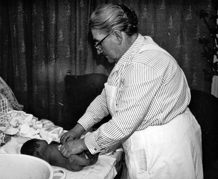 Vroedvrouw mevr. Beerends aan het werk.