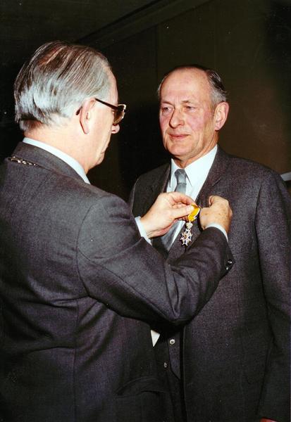 Secretaris R. Hover wordt door burgemeester Hendrix geridderd.