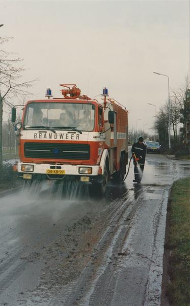 De brandweer spuit de weg schoon na de overstroming.
