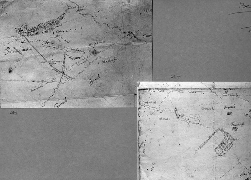 Een dubbele foto van twee oude kaarten uit ca 1700 van de omgeving van het Meerlebroek en het Beesels Broek met Baxhoeff (Baxhof).