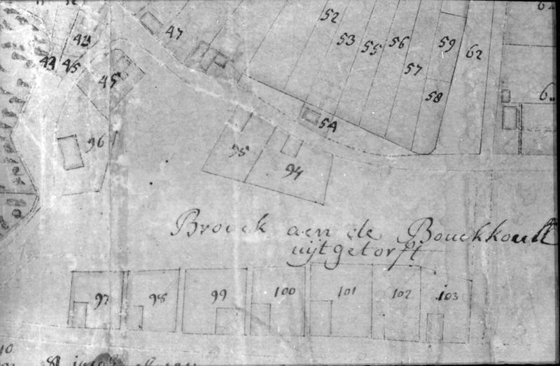 Oude landkaart van Boukoul met vermelding "Broock aan de Bouckkoull uijtgetorft". Fragment Smaberskaart uit 1778.