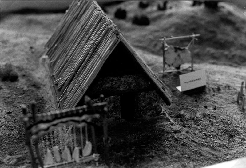 Maquette van een woonhuis tijdens de door de Archeologische Werkgroep Beesel georganiseerde tentoonstelling "Bieslo aen die Maese " in de hal van het gemeentehuis.
