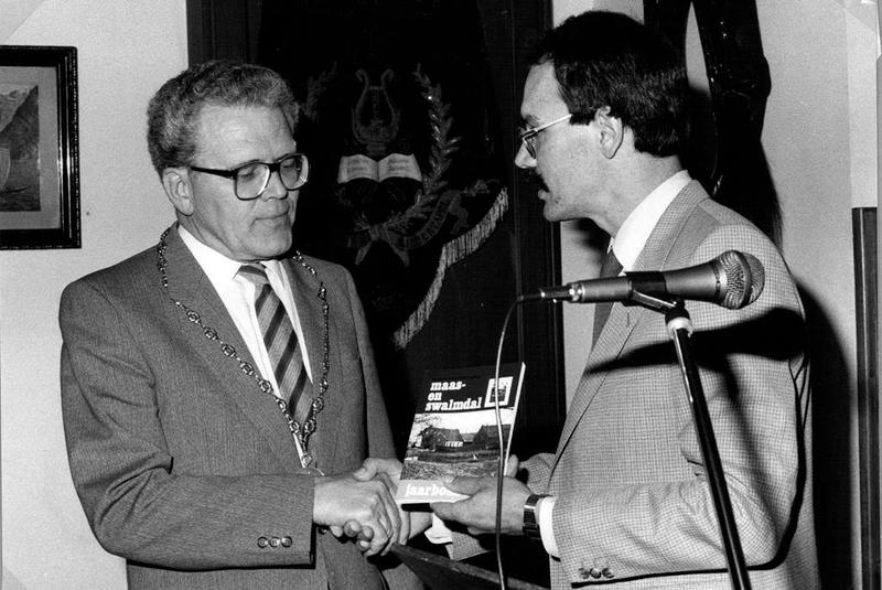 Uitreiking van het jaarboek 1983 aan burgemeester G. Boots van Swalmen in café De Zwaan.