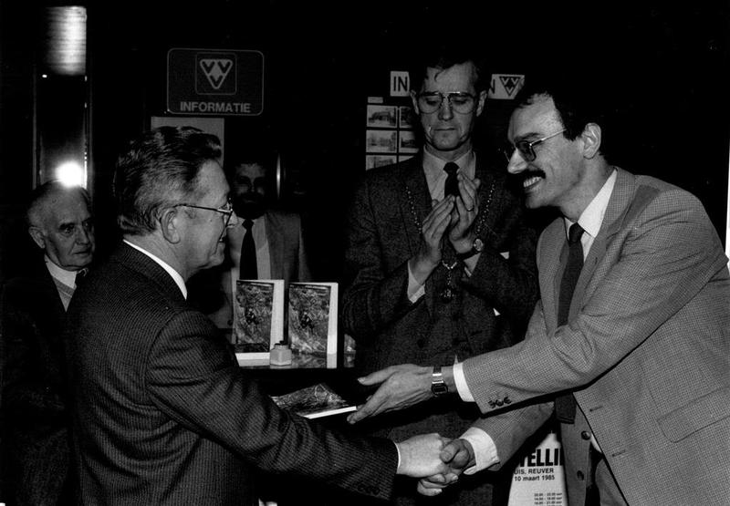 Sjra Vincent ontvangt, in het bijzijn van burgemeester Nuytens, het boek "De laatste loodjes wegen het zwaarst" uit handen van voorzitter Wiel Luys.