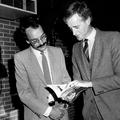 Burgemeester Nuytens en voorzitter Wiel Luys bekijken het nieuwe jaarboek van 1984