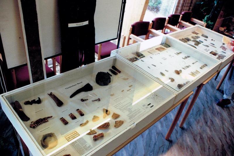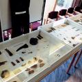 Vitrine met gevonden stenen werktuigen en andere archeologische vondsten.