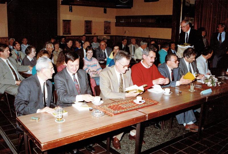 De burgemeesters van Belfeld, Reuver en Swalmen bekijken het jaarboek van 1990. Van links naar rechts: Giel Geraedts, Henk Opsteegh (burgemeester van Swalmen), Constant Nuytens (burgemeester van Beesel), Wiel Slabbers (gem. secretaris Swalmen), NN, Paul Peeters (burgemeester van Belfeld), Wiel Luys