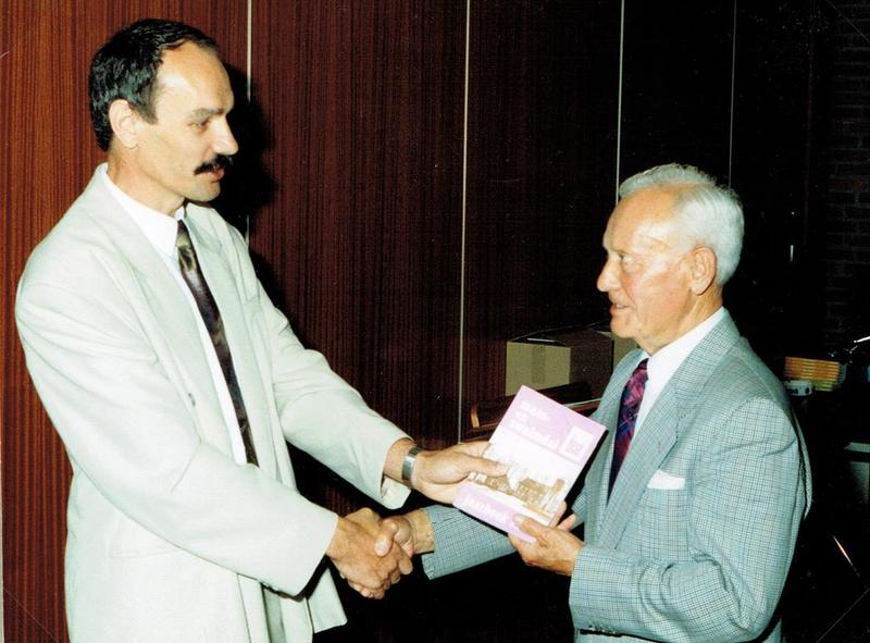 Eregast Sjeng Geurts uit Belfeld ontvangt het jaarboek 1991 van vz. Wiel Luys