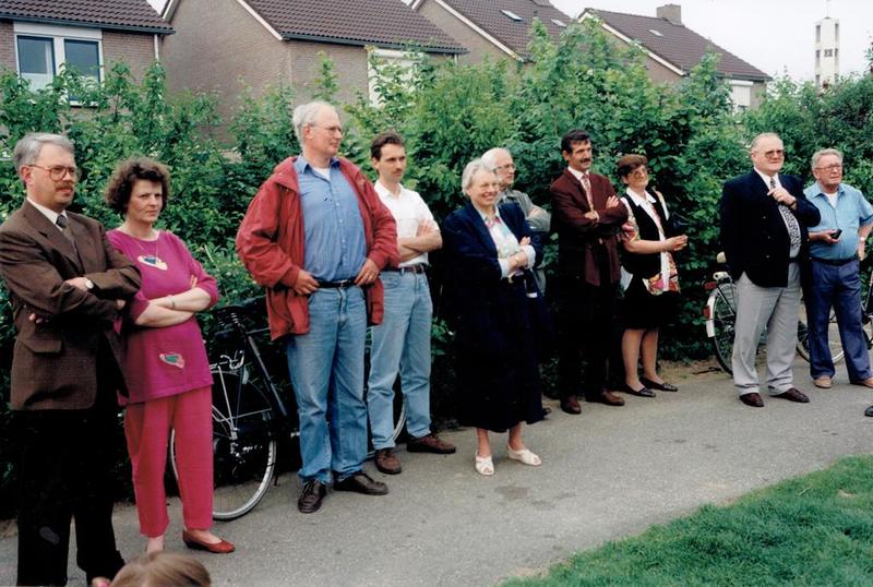 Het monument Heyencamp wordt onthult terwijl Johanna van Dijk-Theunissen en leden van het bestuur van de heemkundevereniging toekijken.