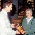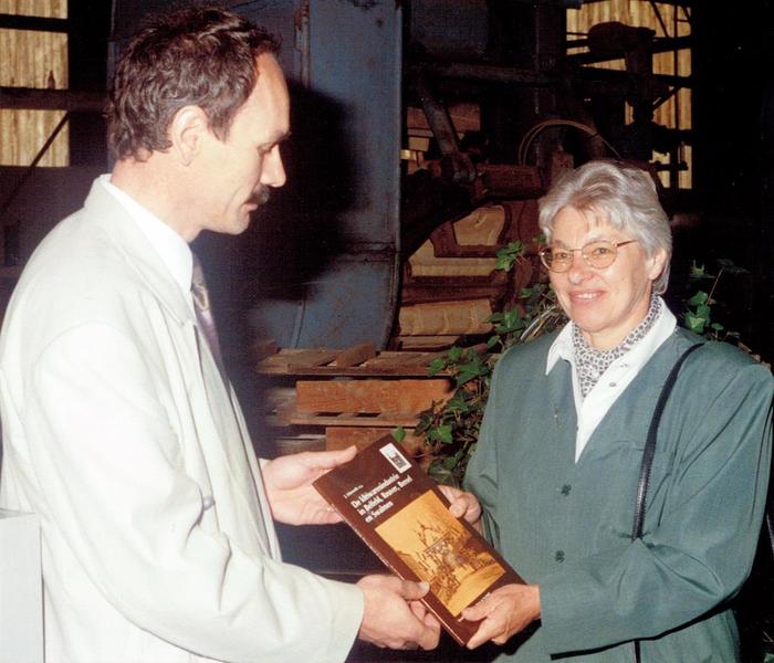 Tijdens de opening van de tentoonstelling "Van Pannesjop tot Kleiwarenindustrie," in de hal van KDN, overhandigde Wiel Luys het eerste exemplaar van het boek "De kleiwarenindustrie in Belfeld, Reuver, Beesel en Swalmen" aan wethouder Johanna van Dijk-Theunissen.