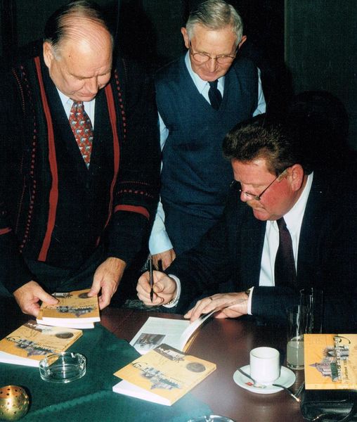 Het jaarboek 1999 aangeboden in café-zaal Ronckenstein aan Wiel van der Velden (voorzitter van schutterij St. Barbara uit Reuver-Offenbeek) met links Frans Killaars en in het midden Hein Bouten.