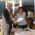 Frans Geerlings van de dorpsgidsen reikt een boekt bloemen uit aan de 5000ste deelneemster Mieke v. Herten.
