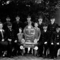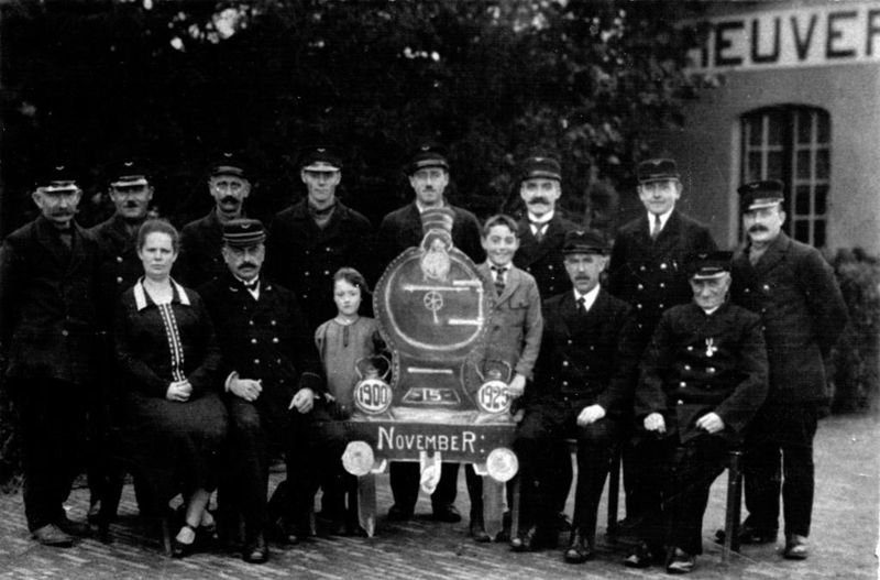 van links naar rechts: zittend 1 Dhr. Saueressig - 2 Mevr. Saueressig - 3 Zus Saueressig - 4 Piet Saueressig - 5 Lindhout 6 Sjang Ickenroth staande Achterste rij: 1 Sef Steeghs, 2 NN, 3 J, Litjens, 4 G. Heldens, 5 W. Janssen, 6 Bos, 7 Nijssen (Beesel), 8 J. Kleyne