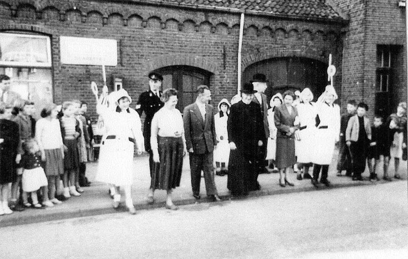 De verkeersbrigadiers helpen Piet Niesen met zijn echtgenote, pastoor N.N , burgemeester Claessen met zijn echtgenote en agent Heldens met oversteken van de Rijksweg ter hoogte van de St. Barbarastraat.