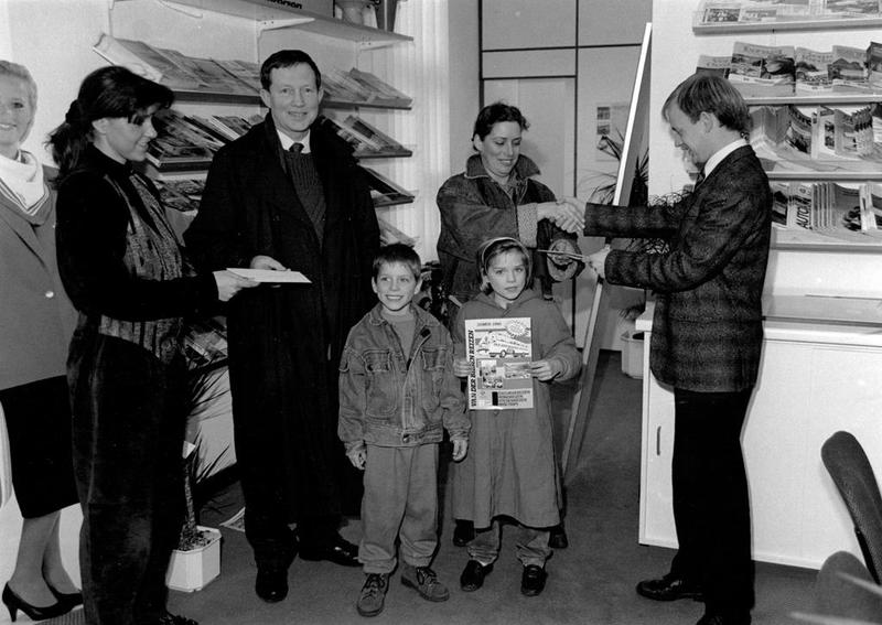 Joop Laarakkers (rechts) van Reisbureau Stassen reikt een prijs uit samen met zijn vrouwelijke collega (links).