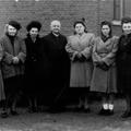 Russische meisjes werden in de oorlog tewerkgesteld onder andere in Brüggen. Zij huwden na de oorlog Reuverse mannen en richtten de vereniging Trojka op. V.l.n.r. Luba Janssen-Komendrowskaja, Wasilina Smeets-Schornobriwa, Nina Timmermans-Salaewa, Masha Blomen-Pilipenko, Pater van der Malen, Klara Niesen-Holowko, Olga Willemsen-Morgan, Nina Ottenheim-Andrintschenko en Anna Schoolmeesters-Stoljarowa.