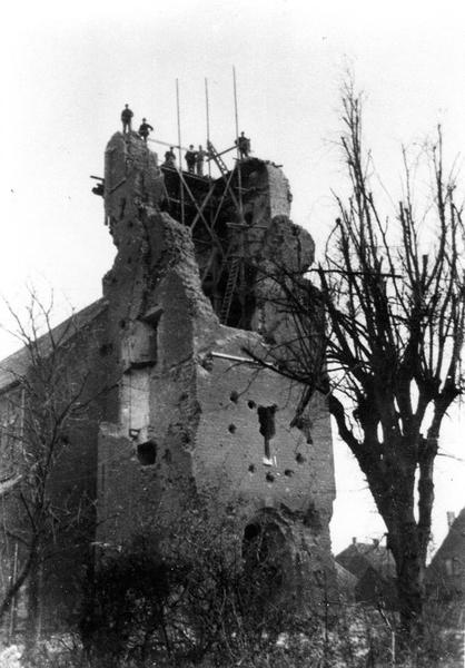 De zwaar beschadigde St. Gertrudiskerk. De toren was er helemaal van af geschoten.