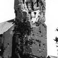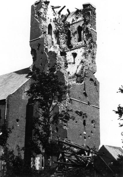 De zwaar beschadigde toren van de St. Gertrudiskerk in Beesel
