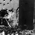 De kapot geschoten ingang van de St. Gertrudiskerk in Beesel