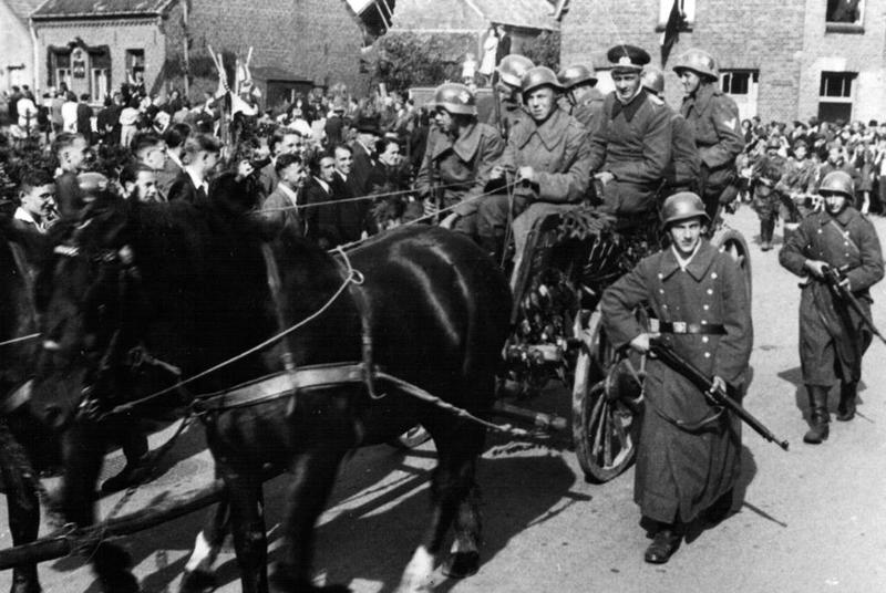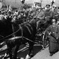 De bevrijdingsoptocht in Swalmen. Op de foto de wagen "Zo kwamen ze". Op de wagen v.l.n.r. eerste rij: Mathieu Engelen en Jan Geraedts. Tweede rij: Piet Piepers en Sef Franssen (Hauptmann). Derde rij: Frits den Holder, Jan Engelen en Pierre Engelen (Obergefreiter). Naast de wagen Jos Leppers gevolgd door Thei Alers.