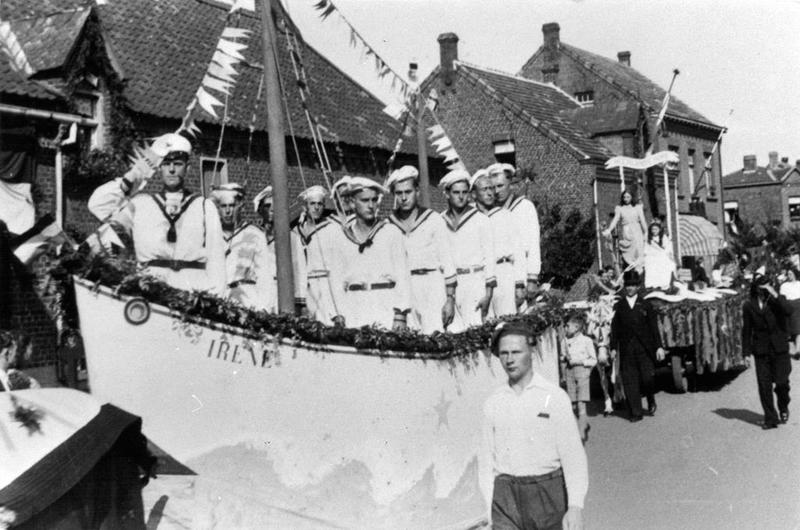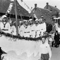 De bevrijdingsoptocht in Swalmen. "Bevrijdingsschip - Hulde aan de Nederlandse Marine" (Buurtschap Heide Swalmen). Op de wagen Jan van Avesaath (saluerend). Voorste rij: Joep Beurskens, Sjeng Strous, Frans Beurskens, Piet van Cruchten en Casper Sander. Achterste rij: Koen Görtz, Sjra Beek, Piet Beek, NN. Naast de wagen Harrie Geraedts.
