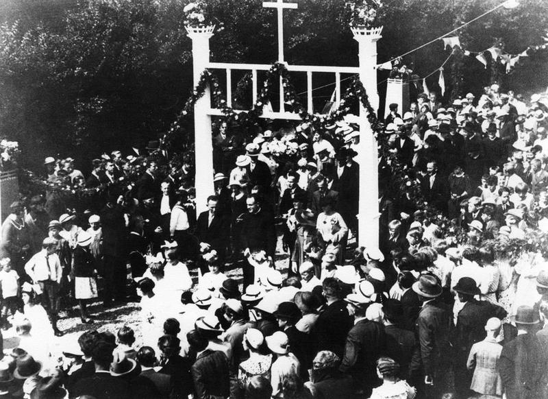 Pastoor G. Pubben op weg, samen met zijn familie, naar de St. Lambertus kerk voor zijn eerste heilige mis.
