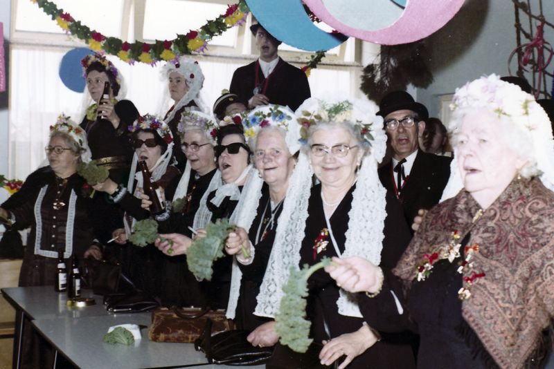 Bovenin: Marie Verstappen en Harie Strijbos. Achter de tafel vlnr: Marie Bongerds, Peulen-Gijzen, Miena Franssen-v. Dijk, Clara Niesen, Nelke Ottenheim, An Janssen-Schouren, Jan Schoolmeesters en Leen Ottenheim.