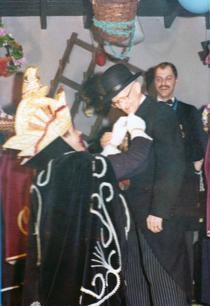 Dreeske Ottenheim krijgt een oorkonde opgespeld van prins Toën I (Toon Hendriks).