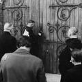 Pastoor P v.d. Broek opent de kerk met de sleutel die hij net van kapelaan Raemakers gekregen heeft.